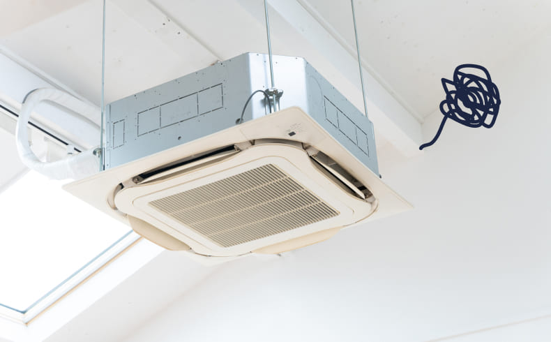 天吊形の業務用エアコンは、天井埋め込み形に比べて設置場所に制限が少なく、広い空間にも適しているため、店舗やオフィス、会議室などでよく使われている。また、天井に吊り下げられるため、壁や床を取らず、空間の有効活用ができる点も魅力的!メンテナンスもしやすく、フィルターの清掃や交換も比較的簡単に行えるため、衛生的な空気環境を保ちやすいです!