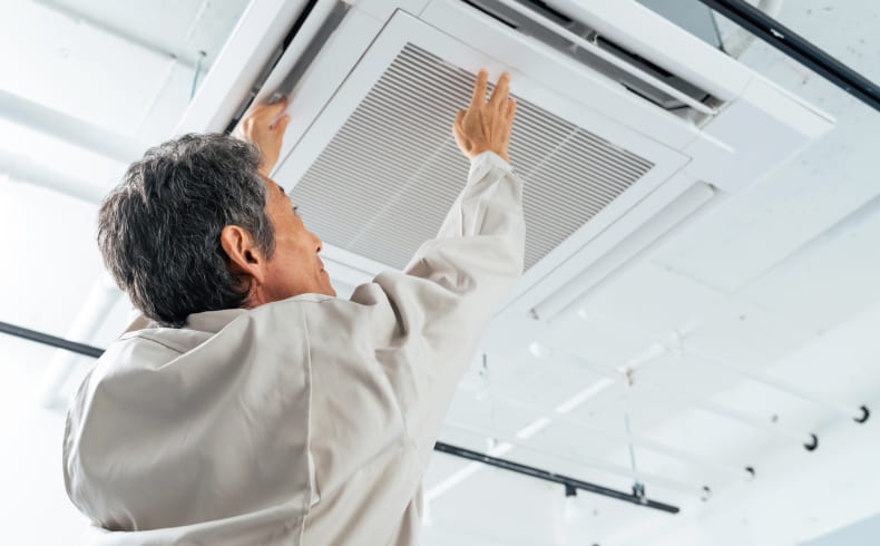 天井埋込み形の業務用エアコンは、室内機が天井に埋め込まれることでスペースの節約ができ、美観性が高いという特徴があります。また、空気の循環が良く、静音性が高いため、快適な環境を保てます。一方で、高い設置技術が必要であり、施工に専門知識が必要です。業者によっては対応できないものもありますがいわき電気工事店 渡部電設工業では対応が可能となっております!